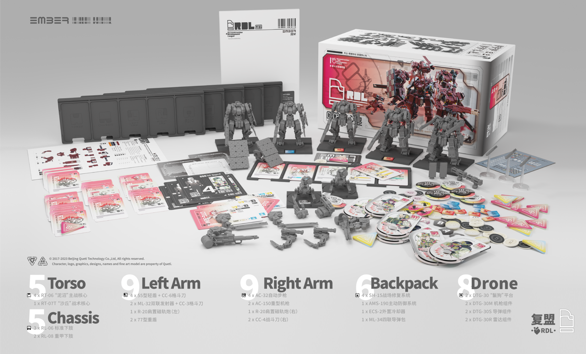 This RDL Corebox combines 5 mechs, 2 Tactical Drones, and a large number of interchangeable modular parts, offering a wide selection of weapons from fully automatic gunnery stations to heavy machine guns, as well as an assortment of auxiliary backpacks and cores that can give your team a tactical advantage.