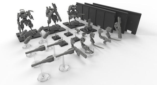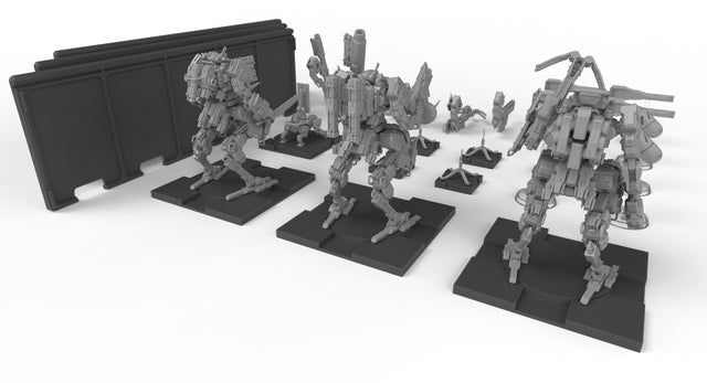 该扩展包提供了一套来自复盟派系的轻型装甲、高机动性单位和组件,以及多种战术辅助工具,您可以利用这些工具构建一个由最多三台高机动性机甲组成的袭击小队,或者将其他复盟套件中的单位进行混合搭配,丰富您的战术选择。